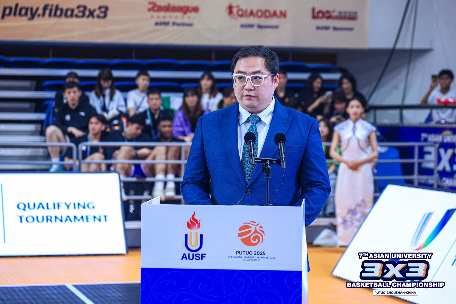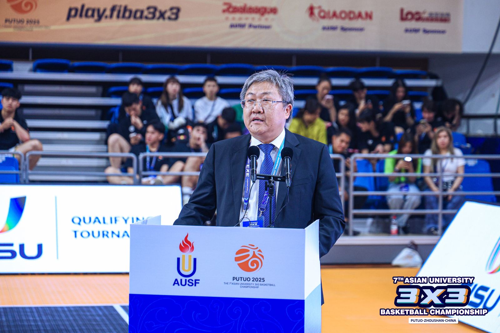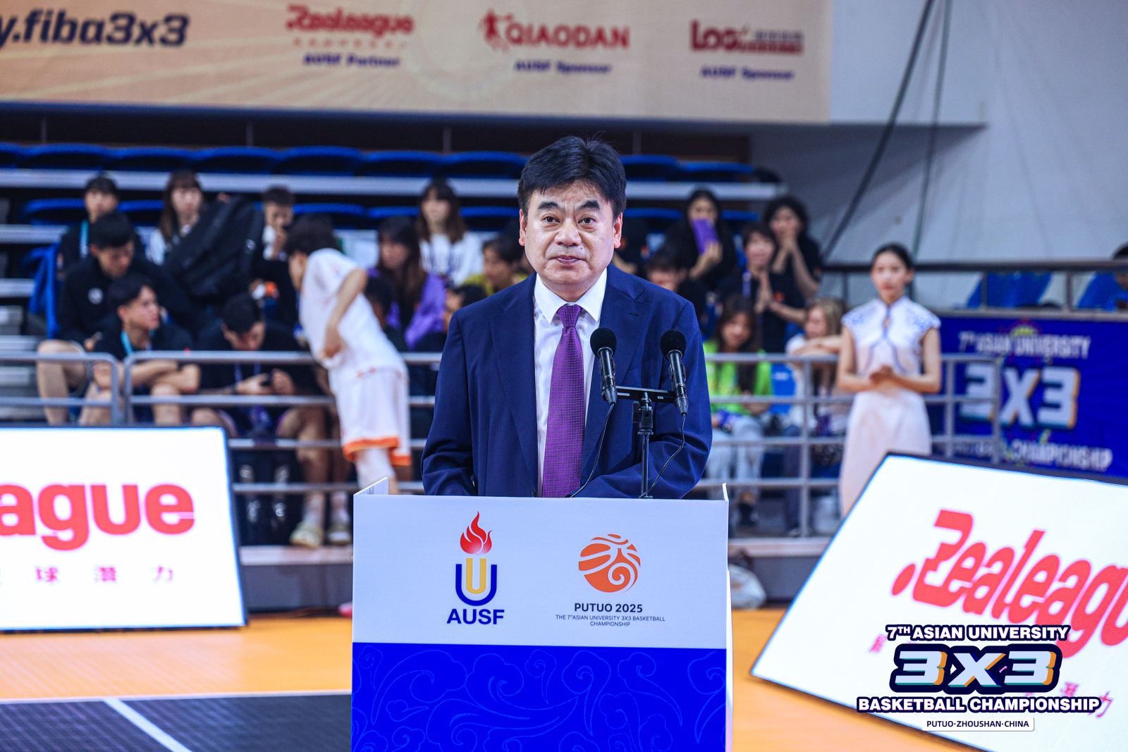 Zhoushan, China – The 7th Asian University 3×3 Basketball Championship kicked off on the evening of May 23 in Putuo District, Zhoushan City, Zhejiang Province, with the first day of competition officially underway. Dr. Liu Lixin, President of the Asian University Sports Federation (AUSF), President and Secretary General of the China Student Sports Federation (CSSF), attended the opening ceremony. Mr. LOU Kit Long, AUSF Regional Representative and CISCA Chair, delivered a speech on behalf of AUSF. The OC President Mr. Sun Zhilong delivered a welcome address, while An Hailong, OC Vice President, presided over the ceremony.