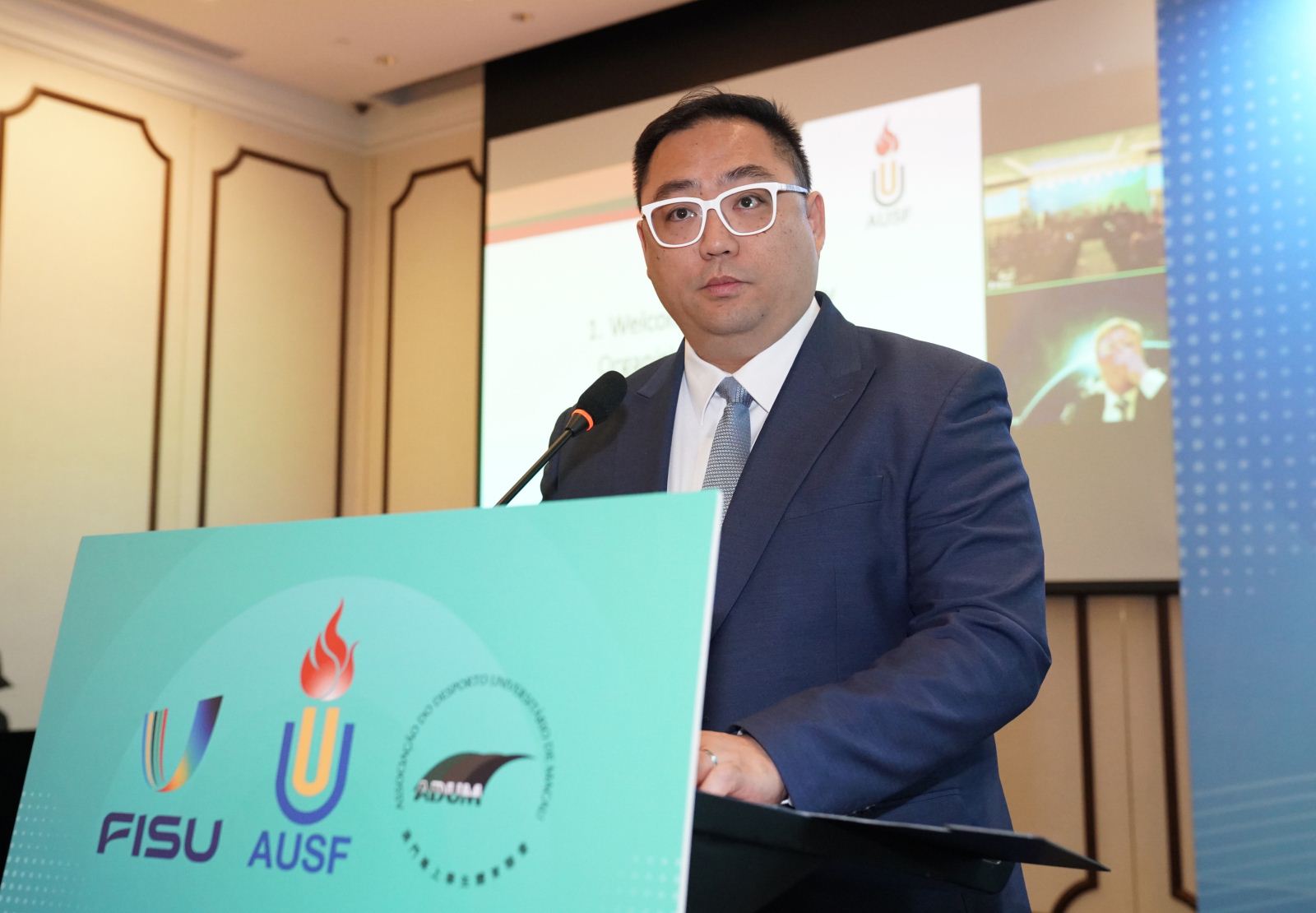 Figure 2:Lou Kit Long, President of the Council of the Macau Universitarian Sports Association, opened the event with remarks highlighting the significance of the AUSF General Assembly.